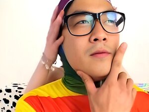 Asian urinates into box