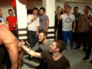 Garage Piss Orgy For Justin - Justin, Mike Roberts, Dobie & Jeremiah Johnson - Boys-Pissing, Justin takes on a gang of friends pissing over him before being spitroasted